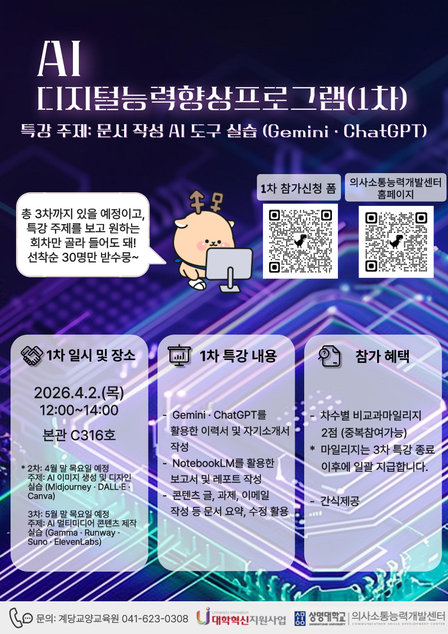 2026학년도 1학기 AI 디지털능력향상프로그램(1차)을 아래와 같이 진행하오니 많은 참여 바랍니다.